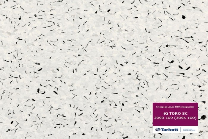 Covor PVC Tarkett iQ Toro SC gri deschis 100 este o pardoseală antielectrostatică, realizată pentru utilizarea în sălile de operaţie, camere de radiologie, camere sterile și laboratoare. Proprietățile conductive avansate sunt obținute prin inserarea de particule de carbon în vinil, împreună cu un suport din carbon pur.