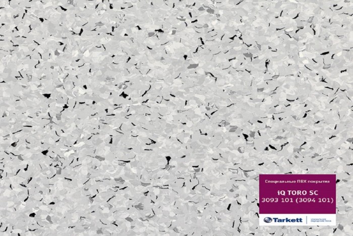 Covor PVC Tarkett iQ Toro SC gri deschis 101 este o pardoseală antielectrostatică, realizată pentru utilizarea în sălile de operaţie, camere de radiologie, camere sterile și laboratoare. Proprietățile conductive avansate sunt obținute prin inserarea de particule de carbon în vinil, împreună cu un suport din carbon pur.
