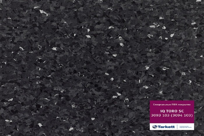 Covor PVC TARKETT omogen conductiv IQ TORO Negru 103 este o pardoseală antielectrostatică, realizată pentru utilizarea în sălile de operaţie, camere de radiologie, camere sterile și laboratoare. Proprietățile conductive avansate sunt obținute prin inserarea de particule de carbon în vinil, împreună cu un suport din carbon pur.